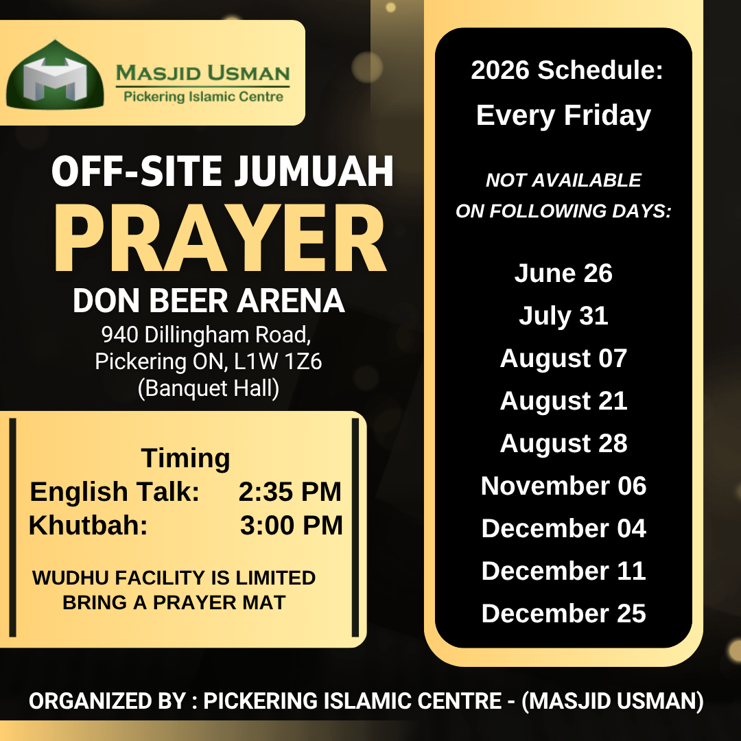 | Off-Site Jumuah (Don Beer Arena Banquet Hall) Click Here for Schedule |