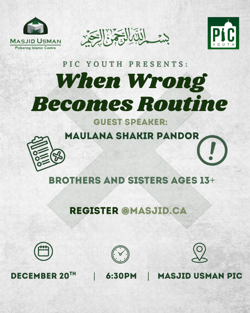 The PIC proudly serves the Pickering community, providing excellent service in adherence to the Quran and Sunnah. We aim to instil an Islamic education in our children and adults in need, as well as provide our youth with academic learning in accordance to provincial standards. Together with the community and other Islamic Organizations, we shall spread Islamic knowledge and display to our nation at large the beautiful face of our religion. Ameen.