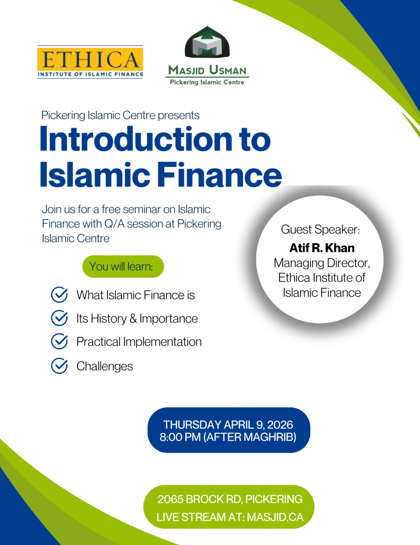 Pickering Islamic Centre, in collaboration with Ethica Institute of Islamic Finance, invites you to a powerful and insightful seminar on the foundations and future of Islamic finance.