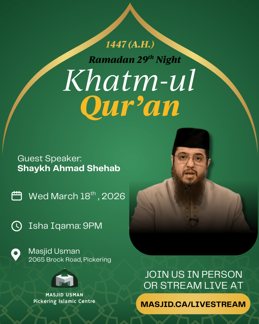 We invite you and your family to join us for the blessed night of Khatm-ul-Qur’an at Masjid Usman – Pickering Islamic Centre.