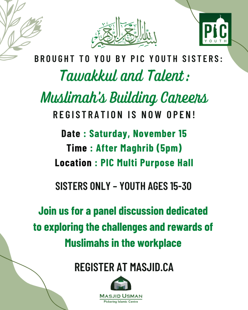 The PIC Sister's Youth Team is excited to host a panel discussion exploring the challenges and rewards of Muslimah's in the workplace!